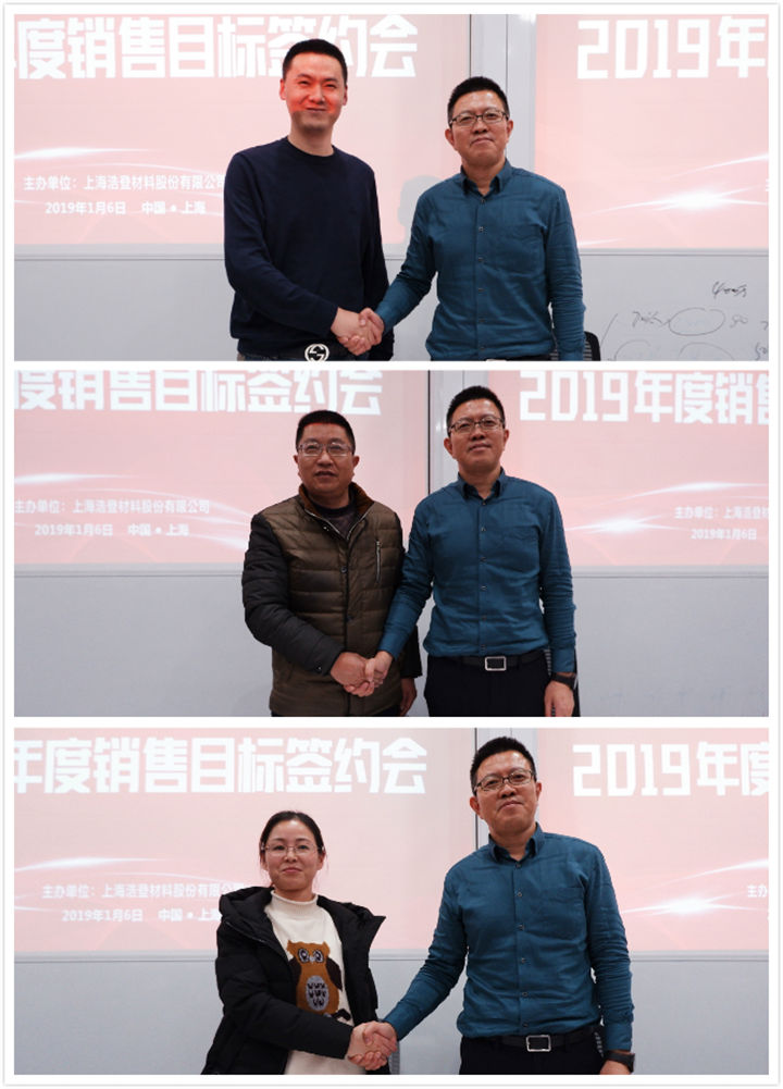 會(huì)議最后,公司銷(xiāo)售總監(jiān)王總、江蘇康樂(lè)佳吳總、寧夏倬昱新材料趙總分別與公司董事長(zhǎng)簽訂了2019銷(xiāo)售目標(biāo)責(zé)任狀及分公司目標(biāo)責(zé)任狀。
