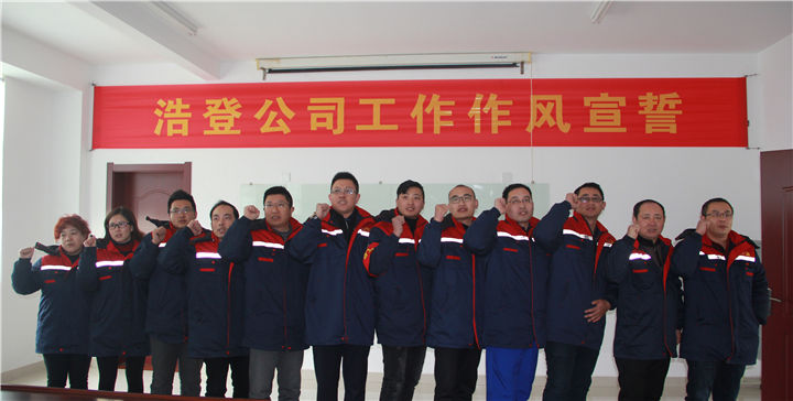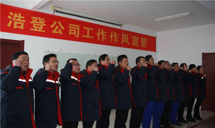 2月5日上午,浩登公司在濱海生產(chǎn)基地會(huì)議室召開(kāi)工作作風(fēng)宣誓大會(huì),在公司董事長(zhǎng)沈健的帶領(lǐng)下,公司管理人員一起舉起右手,莊嚴(yán)宣誓:“作為浩登公司的一名主管,我鄭重宣誓:我認(rèn)同浩登公司的價(jià)值觀和發(fā)展愿景,并愿意為之努力奮斗;我們發(fā)揚(yáng)團(tuán)隊(duì)精神,精誠(chéng)協(xié)作,共擔(dān)風(fēng)雨、同享陽(yáng)光。”